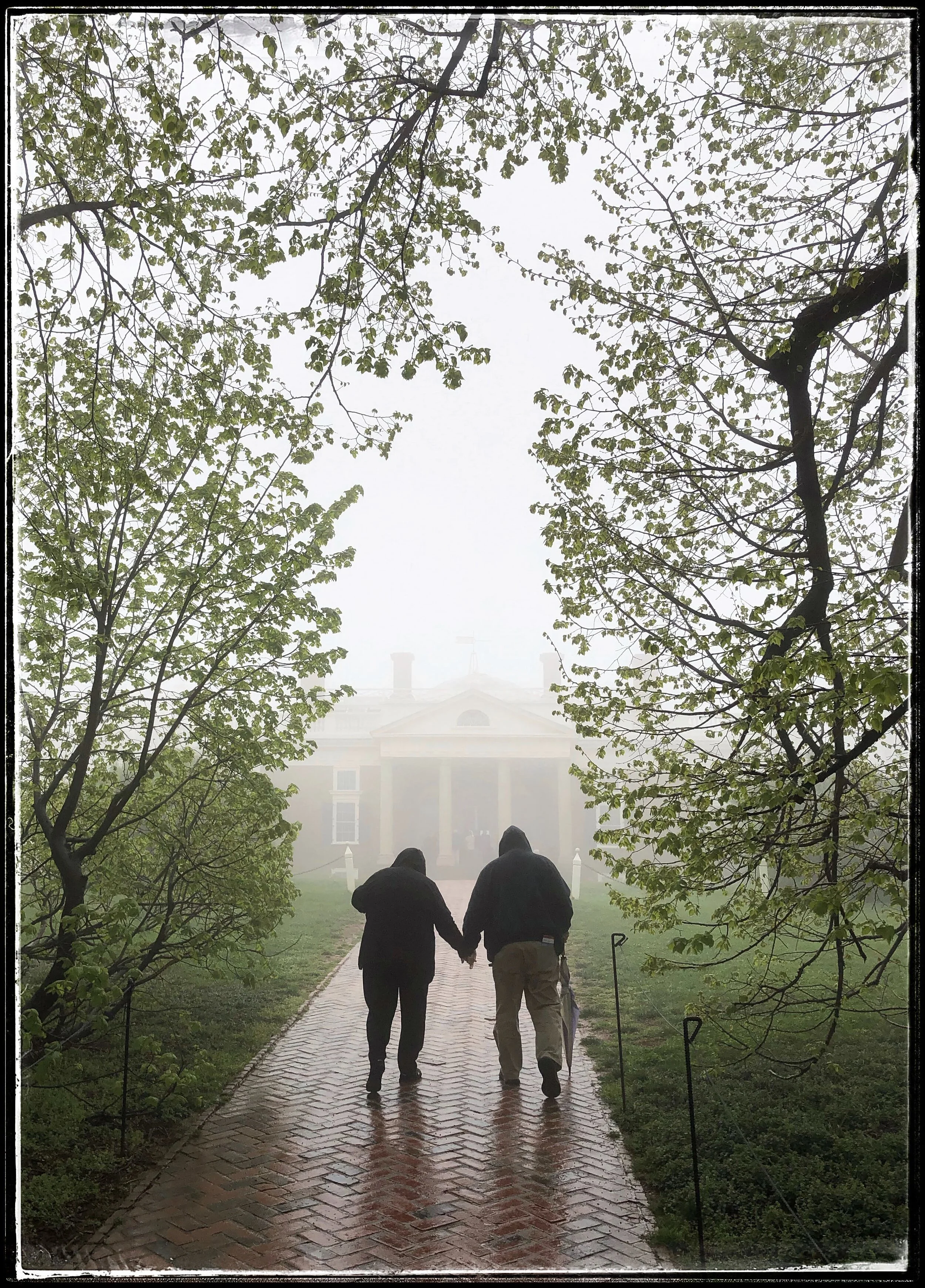 I made this photograph in April 2019 with my mobile phone as my wife and I got off the shuttle bus which took us from the visitor’s center at Monticello to Thomas Jefferson’s home. The couple in the photograph had exited the shuttle bus just before us. I hesitated to share the image with them because I hadn’t even spoken to them and didn't want them to think I was a voyeur. They went on the guided tour that left from the front of Jefferson’s home a half an hour before our tour. I regretted not sharing the photograph with the couple, but I saw them later after our tour and showed it to them and offered to text it to them. They said thank you, and the women gave me her mobile phone number, and I sent the image. The next day I received this moving response:
