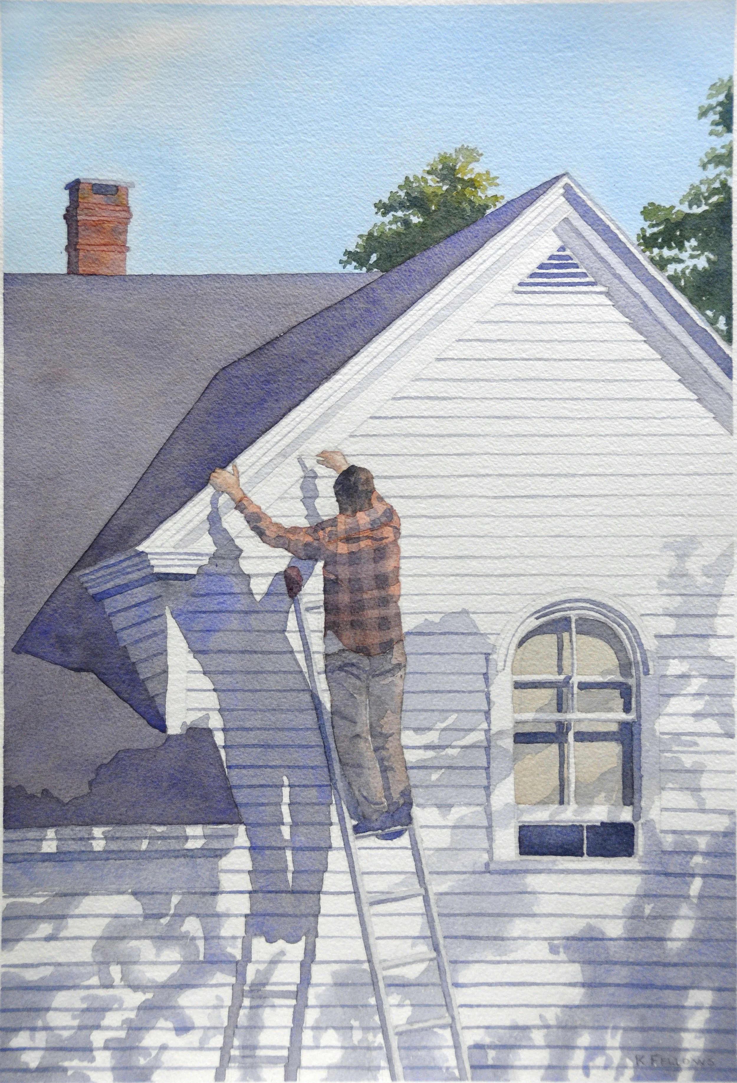 Someone painting a house … not usually a subject to capture in watercolor. Walking past this scene in Stonington, Maine, I was attracted by the painter on his ladder … riveted less by the man than by his graceful, dramatic shadow. How remarkable that an ordinary human, doing such everyday work, could cast a near balletic penumbra. On reflection, this seemed a dramatic physical representation of the concept, existing in both spiritual and psychological literature, that human personalities have both a consciousness and a latent shadow side.